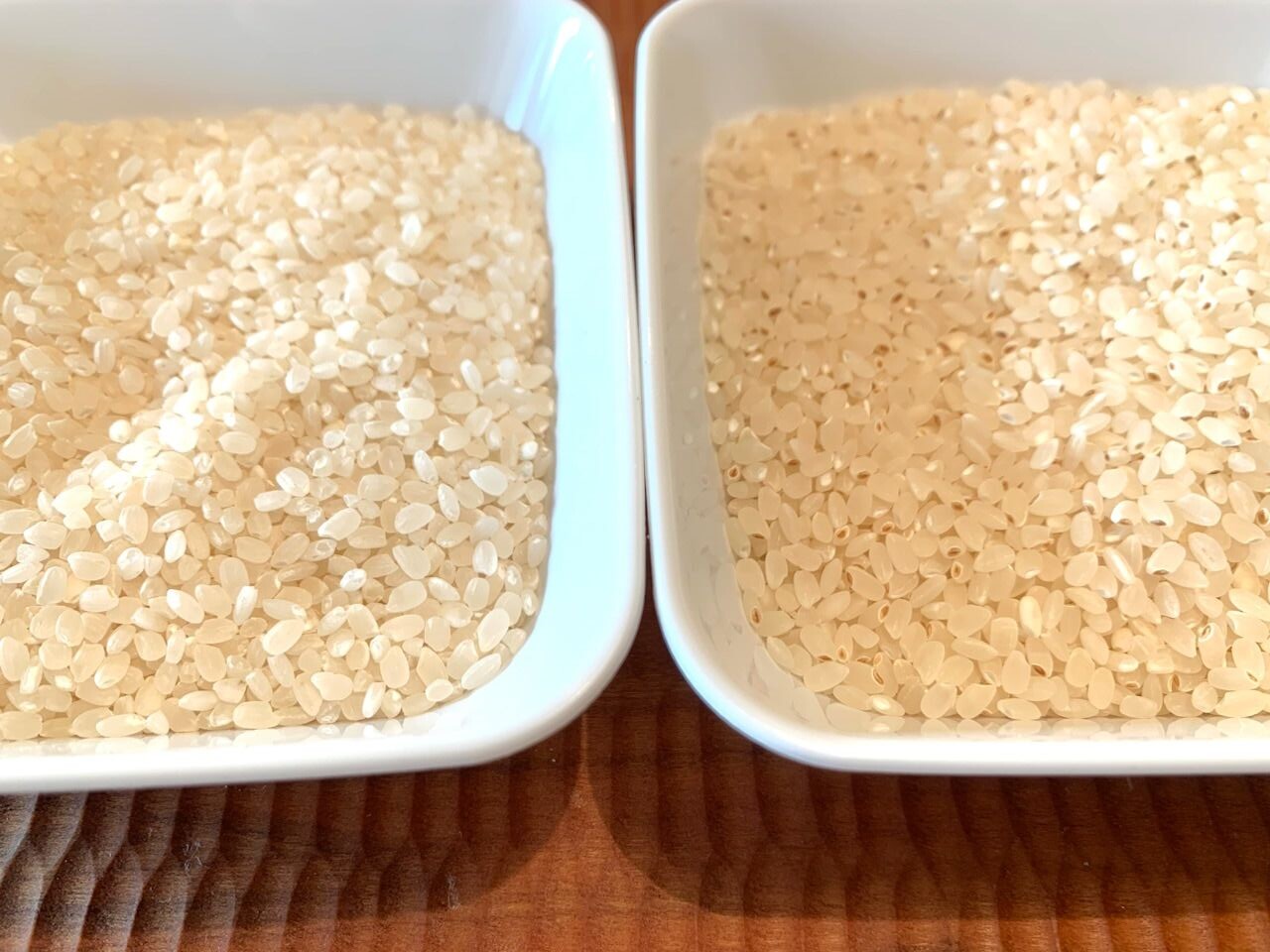 右が未精米。胚芽部分が黒ずんでいます。左が再精米後。割れ米も結構ありました。